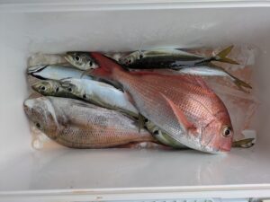 釣果 0.6㎏~1.1㎏ 1~2枚 他 アジ 30cm前後 8~10匹