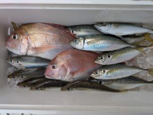 | 釣果 | 25~40cm 9~32匹 他 マダイ、イトヨリ、シイラ、ソウダ |